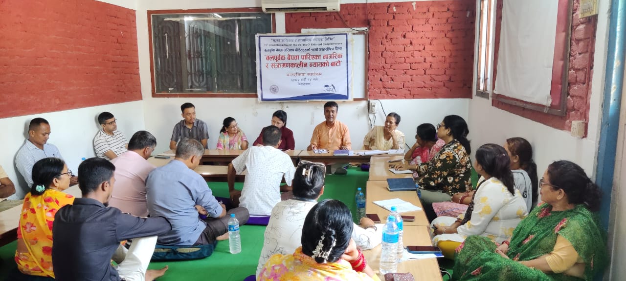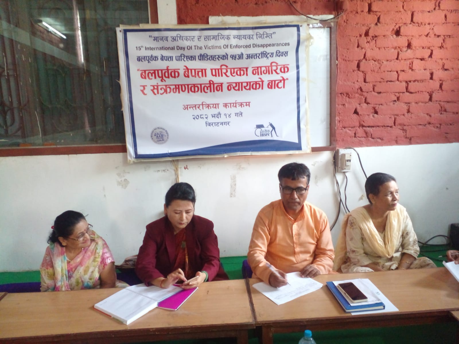 इन्सेक कोशी प्रदेश र मानवअधिकारका लागि एक महिला समूहको आयोजनामा बलपूर्वक वेपत्ता पारिएका नागरिकहरूको १५ औं अन्तराष्ट्रिय दिवसका अवसरमा ‘बलपूर्वक वेपत्ता पारिएका नागरिक र सङक्रमणकालीन न्यायको बाटो’ विषयक अन्तक्रिया कार्यक्रम सम्पन्न गरिएको हो ।