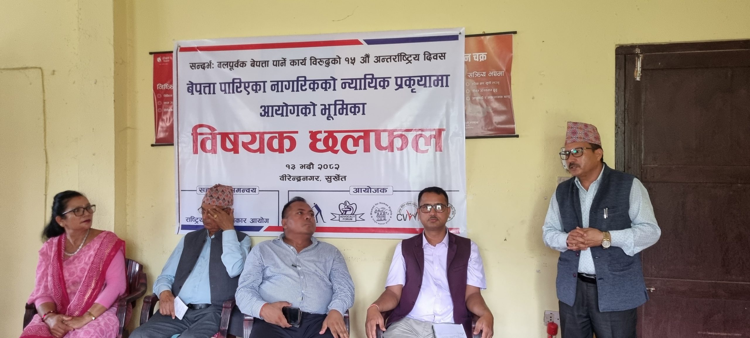 इन्सेक कर्णाली प्रदेश कार्यालय, एडभोकेसी फोरम कर्णाली प्रदेश, महिला अधिकारका लागि एकल महिला समुह सुर्खेत, द्वन्द्वपीडित महिला राष्ट्रिय सञ्जाल र सिमान्तकृत महिलाहरुका लागि महिला संस्था वामको संयुक्त आयोजना तथा राष्ट्रिय मानव अधिकार आयोग कर्णाली प्रदेश कार्यालयको समन्वयमा आयोजना गरिएको कार्यक्रममा बेपत्ता पीडित, सरकारी अधिकारी तथा मानव अधिकारकर्मीले बेपत्ता मुद्दामा तत्काल न्याय दिलाउनुपर्नेमा जोड दिएका थिए । महिला अधिकारका लागि एकल महिला समुह सुर्खेतकी अध्यक्ष ममता नगालले सञ्चालन गरेको कार्यक्रममा ५० जना पीडित र सरोकारवाला व्यक्तिहरुको सहभागिता रहेको थियो ।