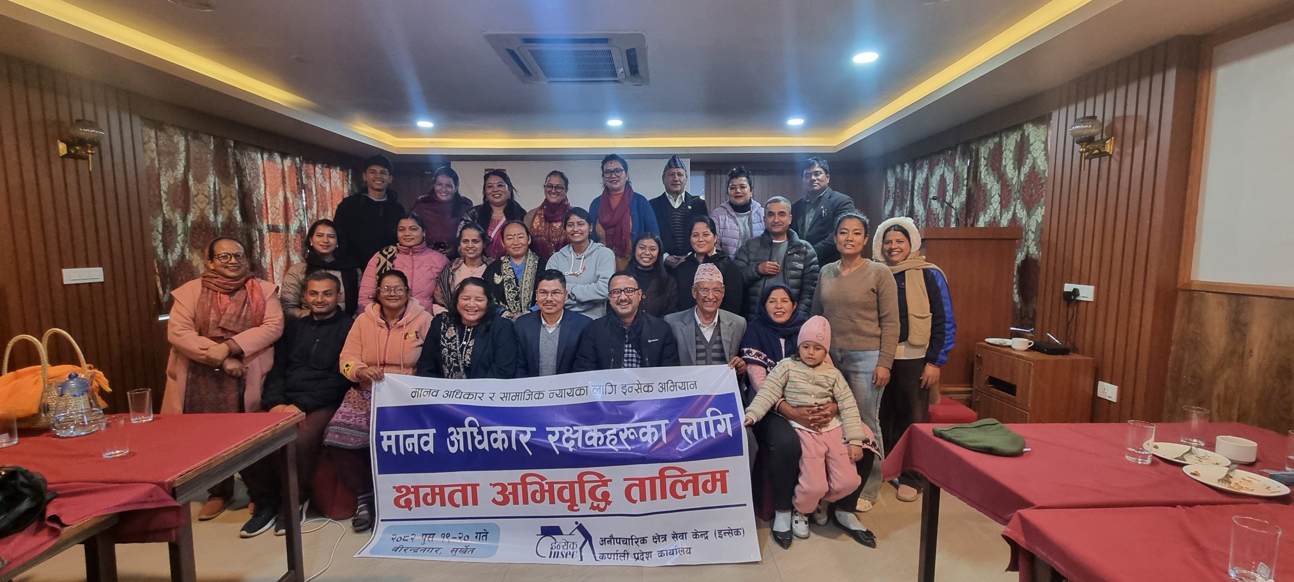अनौपचारिक क्षेत्र सेवा केन्द्र (इन्सेक) कर्णाली प्रदेश कार्यालयको आयोजनामा ०८२ पुस १९ गतेदेखि वीरेन्द्रनगरमा सुरु गरिएको मानव अधिकार रक्षकहरुका लागि क्षमता अभिवृद्धि तालिम  पुस २० गते सम्पन्न गरिको छ । तालिममा मानव अधिकारमा आधारित दृष्टिकोणको ज्ञान र व्यवहारिक प्रयोग, आर्थिक ,सामाजिक, तथा सांस्कृतिक अधिकार, मानव अधिकार रक्षक सम्बन्धी अवधारणा, मानव अधिकारका मुद्दाहरूको पहिचान,  शिक्षा, स्वास्थ्य, वातावरण संरक्षण, व्यवसाय र मानव अधिकार, वातावरणीय अधिकार, लैङ्गिक हिंसा र जातीय विभेद, बालअधिकारको प्रवद्र्धन र संरक्षण सम्बन्धी विषयहरुमा छलफल गरिएको थियो ।