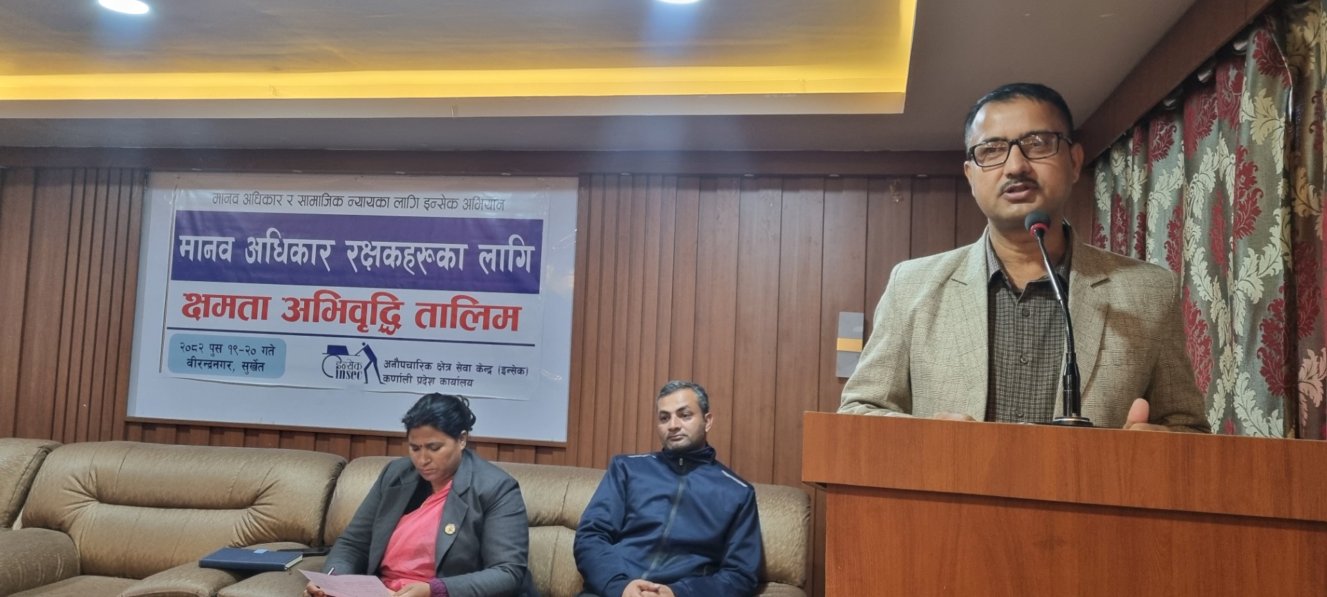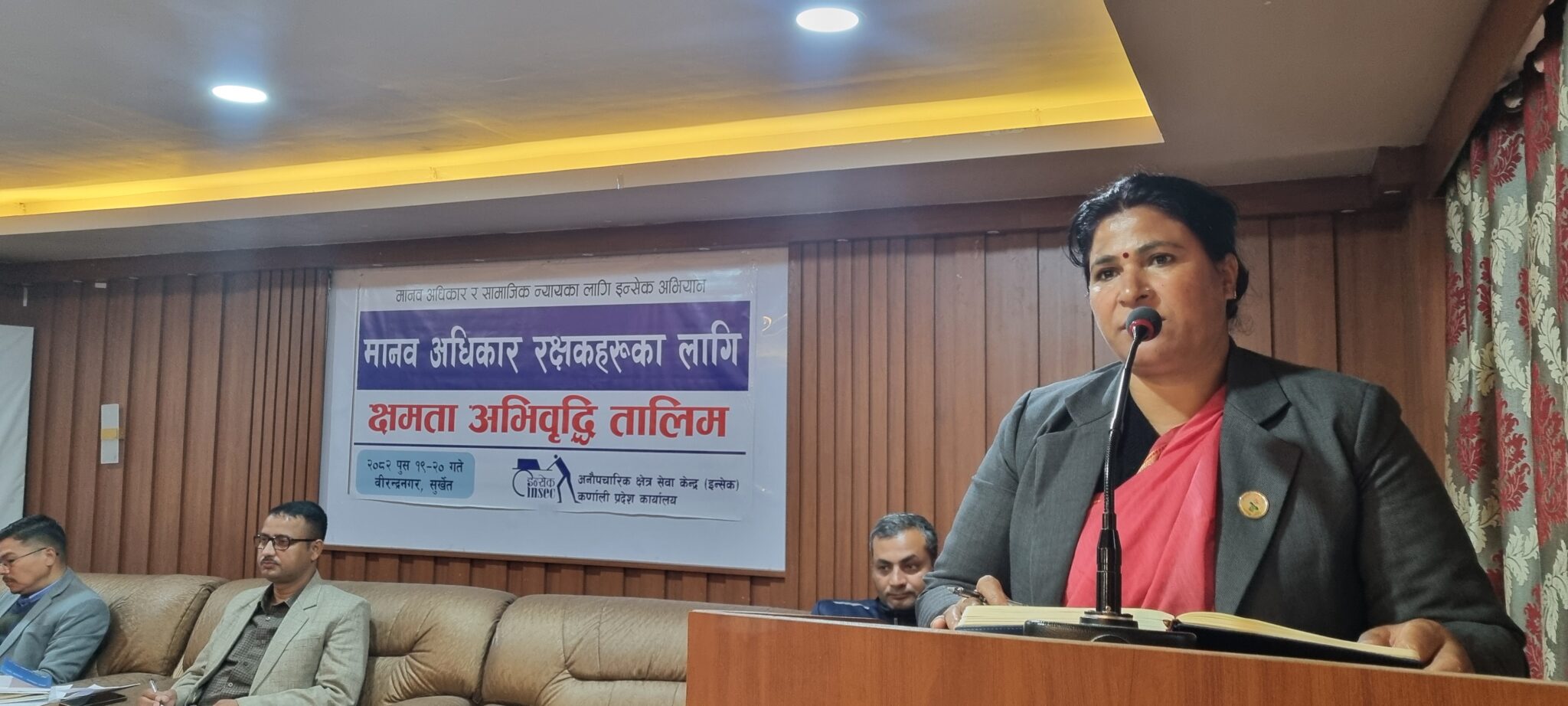 अनौपचारिक क्षेत्र सेवा केन्द्र (इन्सेक) कर्णाली प्रदेश कार्यालयको आयोजनामा ०८२ पुस १९ गते मानव अधिकार रक्षकहरुका लागि क्षमता अभिवृद्धि तालिम वीरेन्द्रनगरमा सुरु गरिको छ । तालिमको उद्घाटन सत्रलाई सम्बोधन गर्दै कर्णाली प्रदेश सरकारकी पूर्व उर्जा मन्त्री एवं प्रदेश सभा सदस्य उर्मिला विश्वकर्माले अरुको अधिकारका लागि वकालत गर्ने रक्षकहरुलाई क्षमता अभिवृद्धिका तालिमको आवश्यकता रहेको बताउनु भयो । उहाँले प्रदेश सरकारमा रोकिएको मानव अधिकार रक्षक विधेयकलाई पास गर्न आफुले भूमिका खेल्ने प्रतिवद्धता जनाउनुभयो । मानव अधिकारकर्मीले आफ्नो अधिकारको सदुपयोग गर्दा अरुको अधिकारको ख्याल राख्नुपर्नेमा जोड दिनुभयो ।