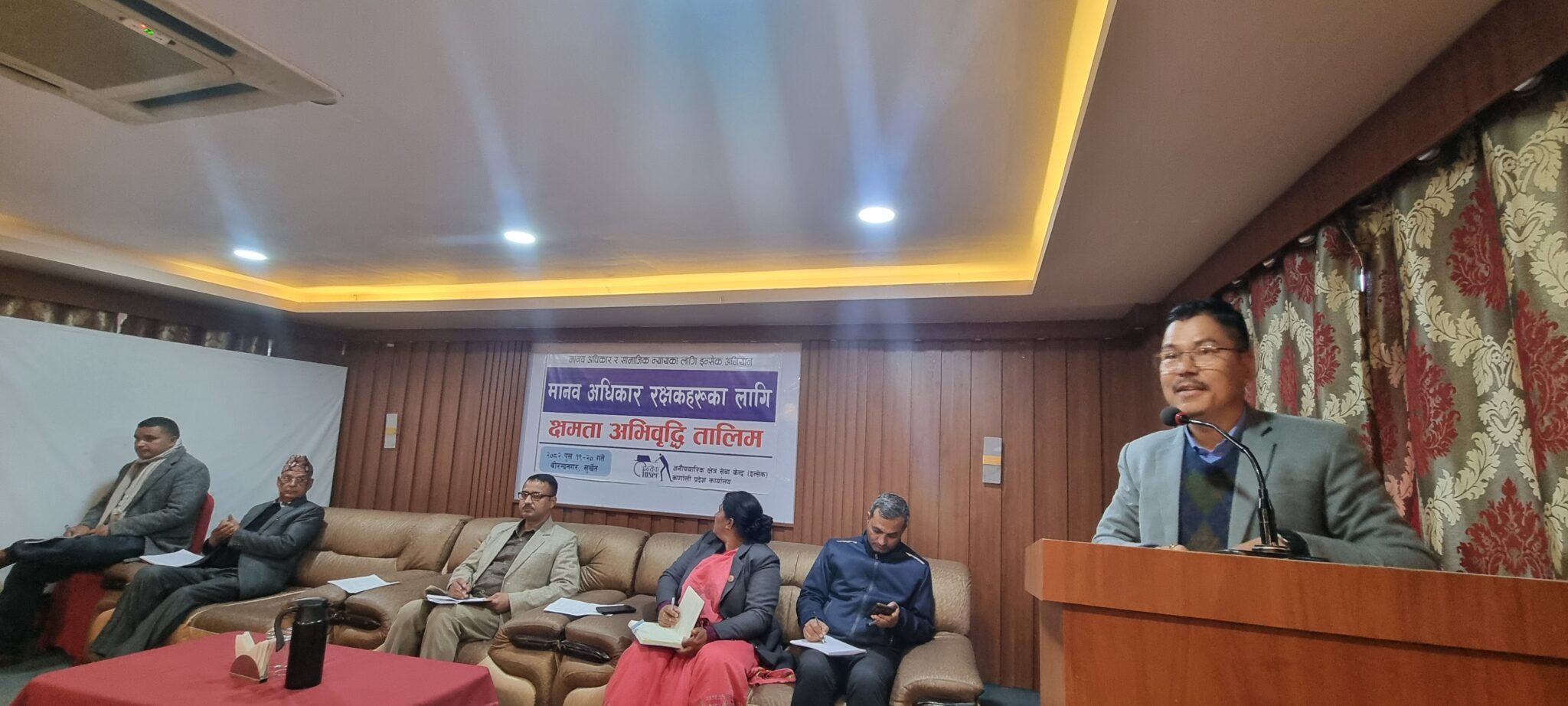 इन्सेक कर्णाली प्रदेश कार्यालयका संयोजक नारायण सुवेदीले स्वागत तथा तालिमको उद्देश्यमाथि प्रकाश पार्दै मानव अधिकार रक्षकहरुलाई पछिल्लो समय थपिएको चुनौतीलाई मध्यनजर गर्दै तालिमको आयोजना गरिएको बताउनु भयो ।