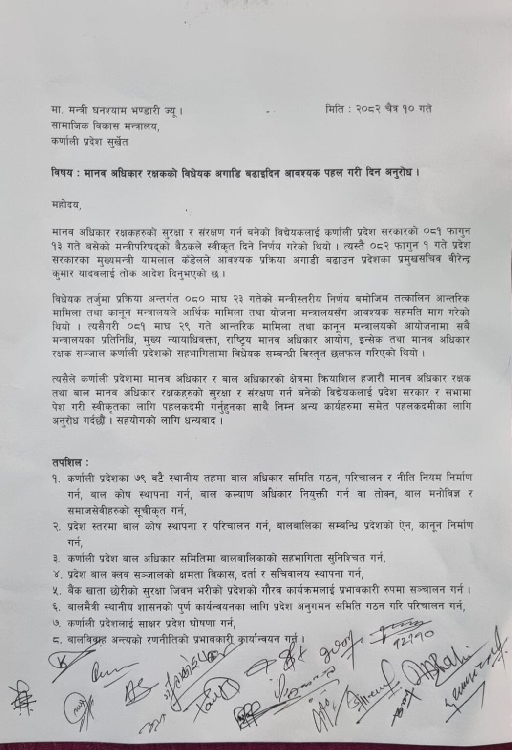 कार्यक्रममा कर्णाली प्रदेश सरकारका सामाजिक विकास मन्त्री घनश्याम भण्डारीले मानव अधिकार रक्षकहरूको सुरक्षा सुनिश्चित गर्नु राज्यको दायित्व भएको बताउनु भयो । उहाँले विधेयकलाई पास गरी प्रभावकारी रूपमा कार्यान्वयन गर्न प्रदेश सरकार प्रतिवद्ध रहेको उल्लेख गर्दै बाल अधिकार संरक्षणलाई प्राथमिकतामा राखिने स्पष्ट पार्नुभयो ।