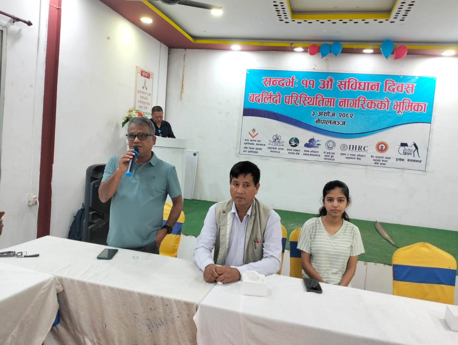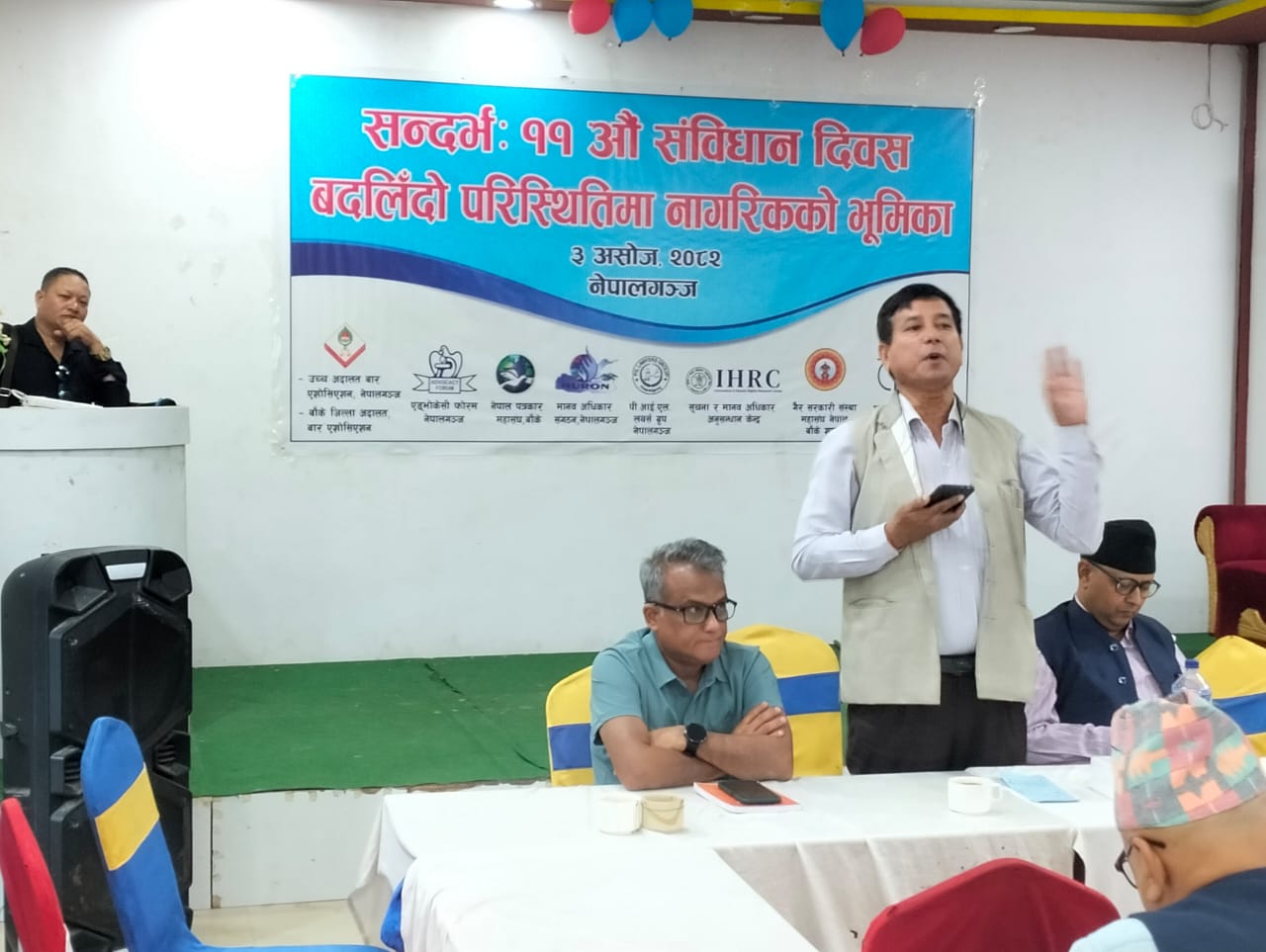 ११ औँ संविधान दिवसको अवसरमा बदलिदो परिस्थितिमा नागरिक समाजको भूमिका विषयक छलफल कार्यक्रममा सहभागीहरुले संविधान भित्रबाटै शासकीय सुधार गरी सुशासन र भ्रष्टाचार मुक्त समाज निर्माणमा गर्नु पर्नेमा जोड दिएका छन् । उच्च अदालत बार एशोसिएसनका अध्यक्ष तथा अधिवक्ता चित्र बहादुर शाहीको अध्यक्षतामा र नागरिक समाजका संस्थाहरु, इन्सेक, उच्च बार, पत्रकार महासंघ बाँके, कानुन व्यवसायीहरुको आयोजनामा ०८२ असोज ३ गते नेपालगञ्जमा छलफल कार्यक्रम सम्पन्न भएको छ ।