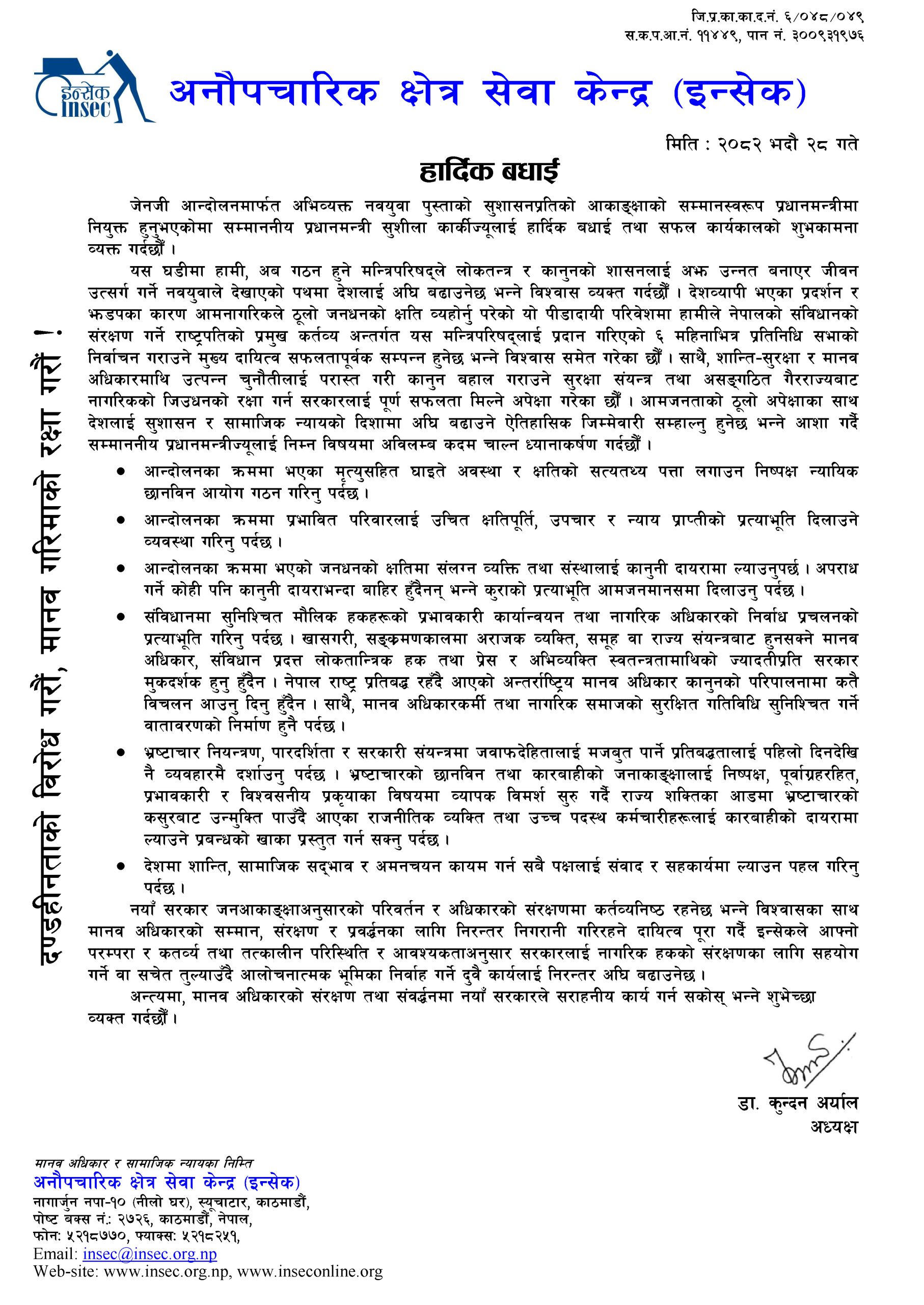 काठमाडौँ । अनौपचारिक क्षेत्र सेवा केन्द्र (इन्सेक) ले अन्तरिम सरकारका नवनियुक्त प्रधानमन्त्री सुशीला कार्कीलाई बधाई ज्ञापन गरेको छ । इन्सेकका अध्यक्ष डा. कुन्दन अर्यालद्वारा हस्ताक्षरित वक्तव्यमा अब गठन हुने मन्त्रिपरिषद्ले लोकतन्त्र र कानुनको शासनलाई अझ उन्नत बनाएर जीवन उत्सर्ग गर्ने नवयुवाले देखाएको पथमा देशलाई अघि बढाउनेछ भन्ने विश्वास व्यक्त गरिएको छ ।